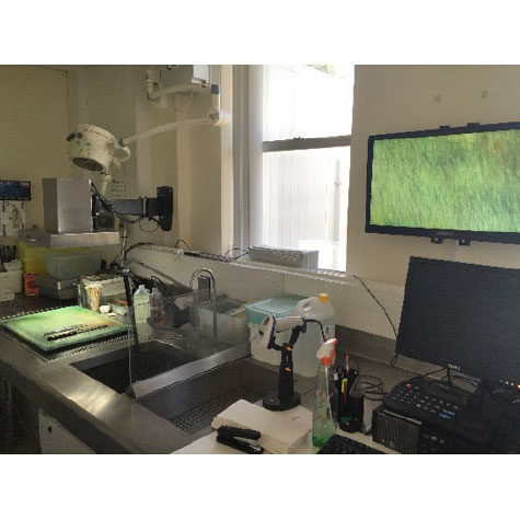 Royal Devon & Exeter NHS Trust’s Grossing Station with a GrosDIS HD imaging system. The system streams a live HD image to a large monitor on the wall and captures images to the PC via a foot pedal so the consultant can continue their work without having to move from the cut up area.